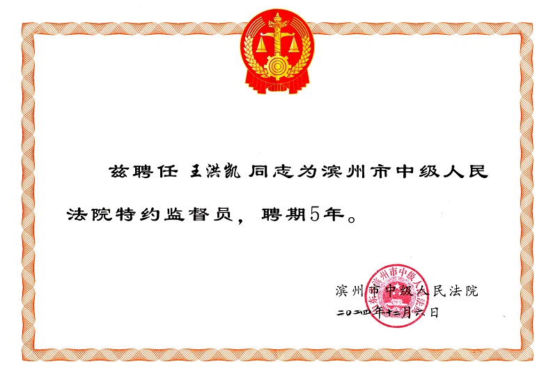 公司董事長王洪凱被推選為濱州中院特約監(jiān)督員